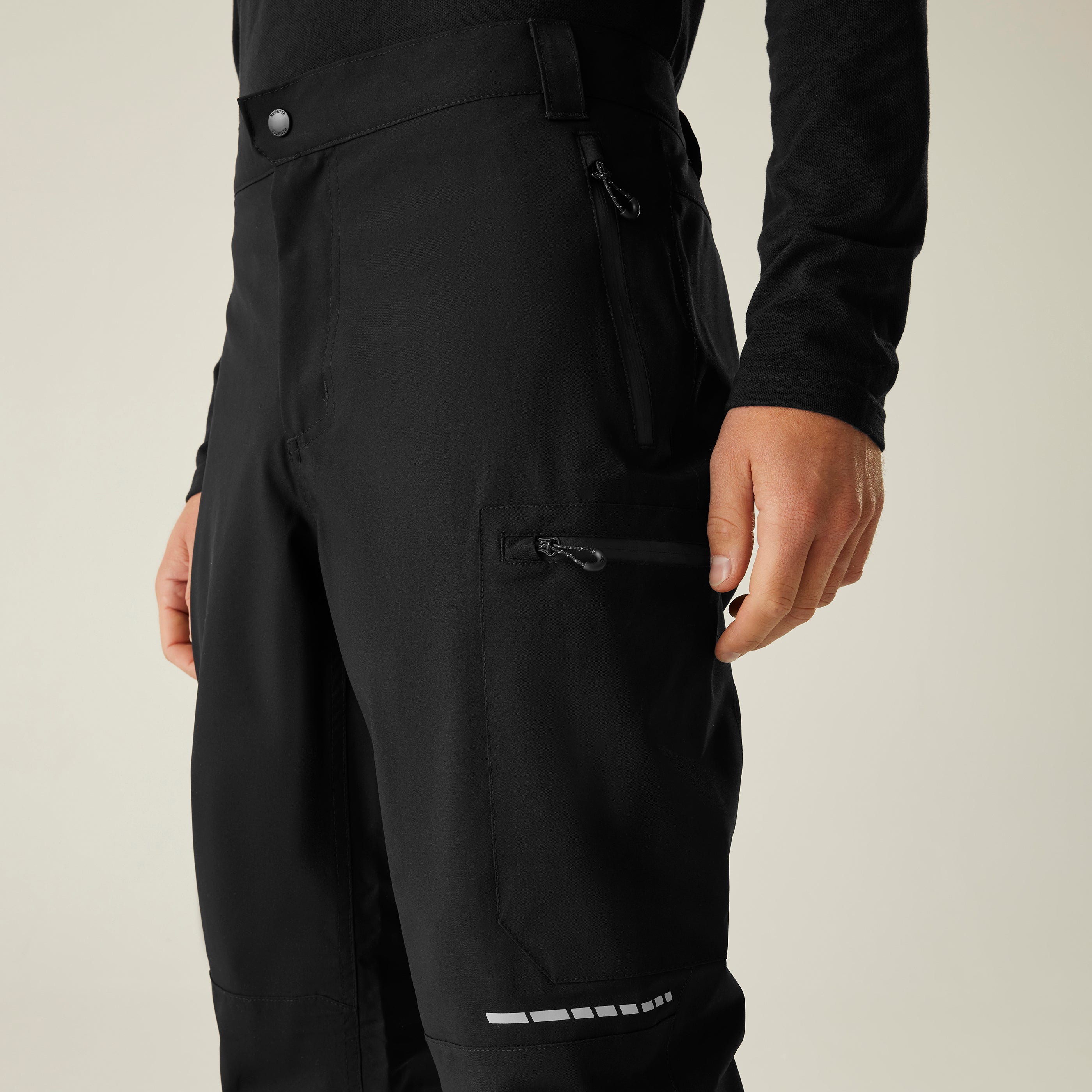 Multiple waterproof zipped pockets, including side and thigh pockets