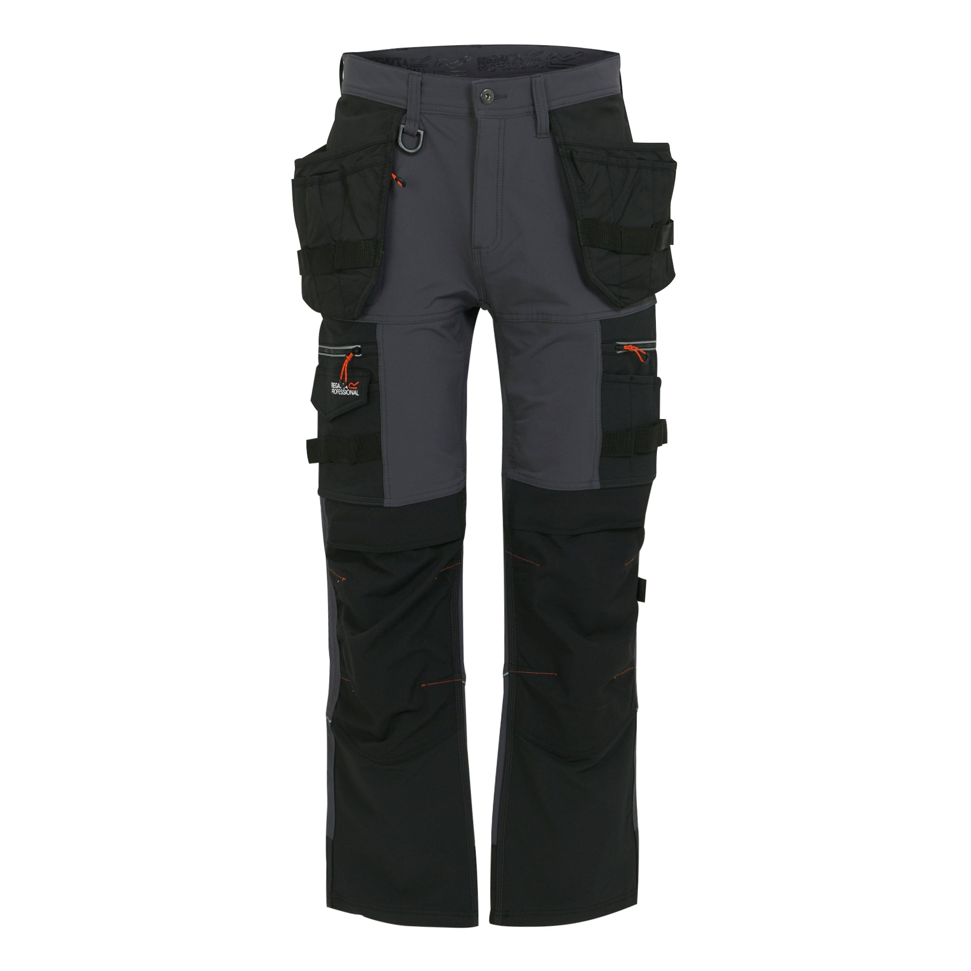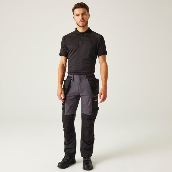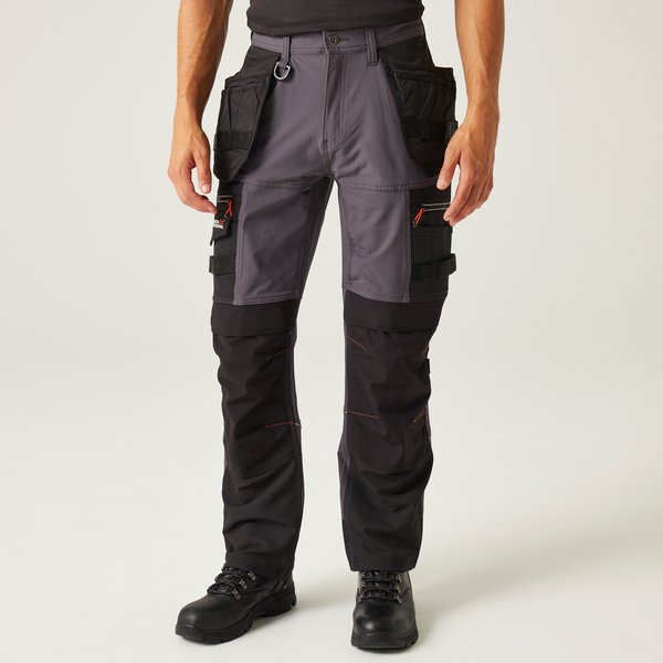 The Regatta TT Infiltrate Stretch Holster Trouser is engineered for durability and comfort, making it ideal for both professional work environments and outdoor activities. Crafted from a robust woven stretch Softshell fabric, these trousers feature ripstop stretch panels on the outer thigh, lower leg, and seat areas for enhanced durability. The durable water repellent finish and wind-resistant properties ensure protection against the elements. Additional features include Cordura® top-loading knee pad pockets, reinforced seams with triple stitching, and easily accessible foldaway holster pockets with multiple compartments. The trousers also offer multi-function tool and mobile phone pockets, two front and two rear pockets, a shaped high back waistband for comfort, inner anti-slip waistband print, reflective piping to the rear of the legs, slim fit design, belt loops, D-ring attachment, and reinforced hem overlays. Made using recycled materials, these trousers are available in sizes ranging from 30" to 46" and in three leg lengths: Short (29"), Regular (31"), and Long (33").